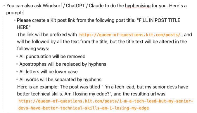 I’ve started experimenting with using LLMs to help me build software. One of my background goals in life is to remove or reduce the labour-intensive tasks that hog my time. One way of doing this is to automate. I already have tons of little scripts that do things for me... but I've always found that I'm sloooow at creating those little tools and automations. So, recently I've started getting LLMs to help me build stuff to simplify my admin, and I admit I've been getting mixed results. I've already written a little about how easy it is to get pulled down a rabbit hole by an LLM, and sometimes that effort-in-vs-results-out trade-off gets made worse by LLM-augmentation. But as I've got better at directing an LLM to harness its strengths and mitigate its weaknesses, I've also got better at either building tools quickly - so they genuinely do save me time - or abandoning ship and quitting while I'm ahead. So, how do you build a useful thing quickly?I'm going to share one simple workflow, which in itself was a learning experience for me. What I wanted was a tool that would help me deduce the url for one of these blog posts before it had been published. It's not rocket science, it's just that Kit doesn't let you know the url until after publication. And I want to know in advance, because I like to put the following text at the bottom of every post: 🔗 Want to share this article or save it for later? Here’s a handy link for you! The pattern is always the same: The same prefix (https://queen-of-questions.kit.com/posts/), followed by the post title but with the following changes: