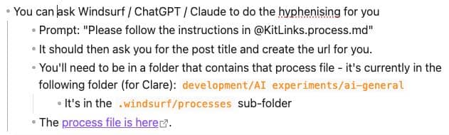 I could build the url myself by taking the post title and manually making those changes. But that's fiddly, annoying and error prone. I could use regex. But I really hate regex. So wouldn't it be lovely if I had a little tool that could do this for me? But this is such a tiny task. A whole tool feels like overkill. Then I remembered, LLMs are really good at regex. OK! So I added this section to my notes on using Kit to write blog posts: I gave the above prompt to the LLM (in this case, GPT-5 in Windsurf). It "thought" for 22 seconds, and then created the correct url for me. I was about to leave it there. But. Every time I want to repeat this process, I'll have to go fetch that prompt from my Obsidian notes. Why keep it there? Why not put it in a process file and have it always on hand for the LLM? I learnt about process files from Llewellyn Falco, and I use them a lot now. So I created this process file and changed my notes: I was going to stop there. This is a tiny tool. I was mindful of that xkcd cartoon I've pasted above. I had other things to be getting on with. I didn't want to over-egg this pudding. But... that's quite a long wait. Twenty-two seconds. Every time I follow this process I'm going to be asking the LLM to reinvent this wheel. Why not, instead, ask it to create a lasting utility, one that'll give consistent results every time and won't require LLM interaction every time it's used? So I gave the LLM the following prompt: Can you take the instructions in @KitLinks.process.md and create a simple html app that will ask the user for a title and then convert it into a url? I got on with what I was doing and left the LLM to it. No more of my time was taken up with this task, but the LLM "thought" for 14 seconds, then another 9 seconds, then gave me this neat little tool, which works delightfully: ...and now my Kit post creation notes look like this: What I love about this, is that the above is a screenshot from instructions on how to generate links for posts like this, in which I have embedded a link to this very post, even though I haven't published it yet, because I used that tool to generate that link to refer to this post about how I created a tool to generate links to posts like this so I could generate them in posts like this... [deep breath]. How meta is that? Scripts vs user interfacesBut why an HTML tool? Why not a simple command line script? I started my software engineering life in 1994, building desktop Windows software. I always preferred what an ex colleague used to call "the clicky-clicky" to the DOS prompt. I used to see colleagues whizzing their way around the command line with a ton of esoteric indecipherable commands. I could never understand why they wouldn't prefer a nice user interface with buttons and labels and a clear visible flow of what was expected from the user*. After all, this is what we software engineers do. We build neat little usable tools with good user experience (UX), to make our users' lives easier. Why wouldn't we want the same for ourselves? I used to feel insecure, ashamed, embarrassed about my preference for nice UX. Like if I wasn't communicating with my machine via opaque gobbledygook, I wasn't a real engineer. But these days I try to quell that voice, remind myself that people are different, shrug and move on. *The answer to "why not clicky-clicky" is often because of the value of config as code. And this is why yes, these days I prefer scripts to clicky-clicky for things like cloud config. But whenever I can wrap that stuff in a nice UI, I totally do. So what's the code like?Honest answer: I have no idea. I still haven't looked*. I don't want to look. I don't care. You can look if you like. It's probably horrible. But so what? It's a very simple tool. It works. I can bookmark it and run it whenever I like, at the click of a button. I always have a browser open, no matter what I'm doing. This way I don't have to spin up a terminal and remember a command. And look at that xkcd cartoon. I'm trying to make my life easy, save time and avoid rabbit holes. I don't need to spend my time looking at the code. And no, there aren't any tests. For anything even slightly bigger or more complex, I would use TDD (test driven development). But I didn't see the need in this case. *Well OK, I have now had a quick look - to check I'm not about to unleash some kind of hideous virus or DOS attack on my machine and the rest of the world. This process works on larger projects tooAs mentioned above, for a larger project I would absolutely use test driven development. I would move in small iterative steps, I would ask the LLM to write tests before every coding step, and I'd make sure those tests passed one at a time. But there were three basic steps I used here that work really well whenever you ask an LLM to make you a thing: